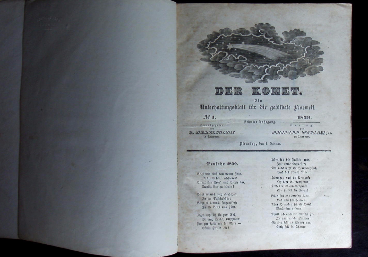 HERLOSSOHN, Carl: (Hrsg.) Der Komet. Ein Unterhaltungsblatt für die gebildete Leserwelt. 10. Jahrgang. Nr. 1- 65 in 1 Bd. Leipzig (Reclam), 1839. 4°. ca 300 S. mit dem Stich Ein französischer Bivouac wird von Kosaken überrumpelt und zahlr. Abb. Beigebunden die Beilage für Literatur, Kunst, Mode, Residenzleben und Journalistische Controle Nr. 1 -13 sowie Leipzig – Berlin – Dresdner Dampfwagen Nr. 1 – 13. HLn der Zeit. Papier altersbedingt gebräunt, Rücken liegt lose bei. Diese Tageszeitung des Vormärz wird selten angeboten. Carl Herloßsohn (eigentlich Borromäus Sebastian Georg Carl Reginald Herloß; * 1. September 1804 auf der Kleinseite in Prag; † 10. Dezember 1849 in Leipzig) war ein deutscher Schriftsteller, Journalist und Enzyklopädist. 1830 gründete er die Zeitschrift Der Komet. Ein Unterhaltungsblatt für die gebildete Lesewelt, die mit ihren zahlreichen Beiblättern (u. a. Zeitung für Reisen und Reisende, 1830–1836; Der Dampfwagen, 1834; Der Luftballon, 1835–1836; Telescop, 1843–1847) zu einem der einflussreichen belletristisch-kritischen Blätter im Vormärz zählt. Neunzehn Jahre lang redigierte Herloßsohn die Zeitschrift, die er schließlich im Revolutionsjahr 1848 aufgeben musste. Herloßsohn starb verarmt im Leipziger Jakobshospital am 10. Dezember 1849. (Wikipedia)