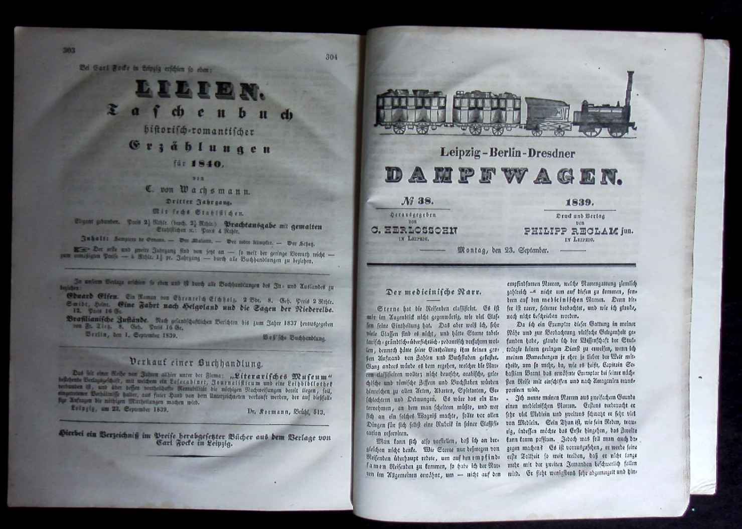 HERLOSSOHN, Carl: (Hrsg.) Der Komet. Ein Unterhaltungsblatt für die gebildete Leserwelt. 10. Jahrgang. Nr. 131- 195 in 1 Bd. Leipzig (Reclam), 1839. 4°. ca 300 S. mit zahlr. Abb. Beigebunden die Beilage für Literatur, Kunst, Mode, Residenzleben und Journalistische Controle Nr. 27 – 39 sowie Leipzig – Berlin – Dresdner Dampfwagen Nr. 27 – 39. HLn der Zeit. Papier altersbedingt gebräunt, Rücken liegt lose bei. Diese Tageszeitung des Vormärz wird selten angeboten. Carl Herloßsohn (eigentlich Borromäus Sebastian Georg Carl Reginald Herloß; * 1. September 1804 auf der Kleinseite in Prag; † 10. Dezember 1849 in Leipzig) war ein deutscher Schriftsteller, Journalist und Enzyklopädist. 1830 gründete er die Zeitschrift Der Komet. Ein Unterhaltungsblatt für die gebildete Lesewelt, die mit ihren zahlreichen Beiblättern (u. a. Zeitung für Reisen und Reisende, 1830–1836; Der Dampfwagen, 1834; Der Luftballon, 1835–1836; Telescop, 1843–1847) zu einem der einflussreichen belletristisch-kritischen Blätter im Vormärz zählt. Neunzehn Jahre lang redigierte Herloßsohn die Zeitschrift, die er schließlich im Revolutionsjahr 1848 aufgeben musste. Herloßsohn starb verarmt im Leipziger Jakobshospital am 10. Dezember 1849. (Wikipedia)