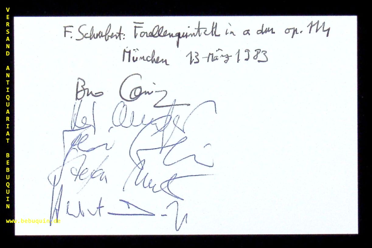 ORLANDO QUARTETT.– CANINO, Bruno (Pianist) + PARKANYI + OBERNDOEFER + ERBLICH + METZ: eigenhändig von allen signierte und datierte Autogrammkarte. München (Schleißheim), 13.3.1983. 8 x 12,5 cm. Karteikarte. Bruno Canino (* 30. Dezember 1935 in Neapel) ist ein italienischer Pianist und Komponist. The Orlando Quartet was a classical music string quartet based in Amsterdam, formed in 1976 and active until 1997. (Wikipedia)