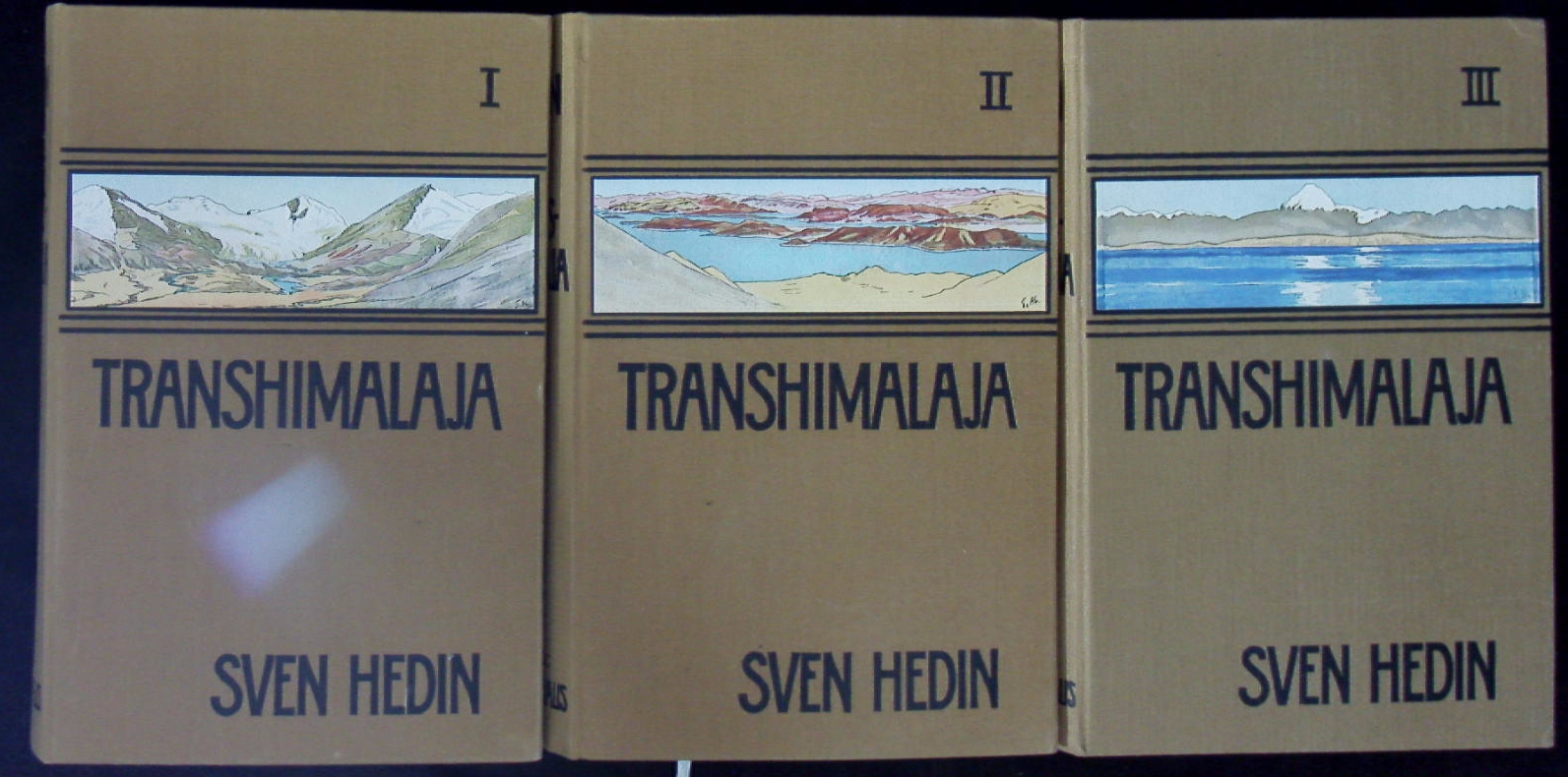ASIEN.– HEDIN, Sven: Transhimalaja. Entdeckungen und Abenteuer in Tibet. 3 Bände. Leipzig (Brockhaus), 1909 / 1912. Gr. 8°. XVIII, 405 S., X, 406 S., x, 390 mit zahlr. Abb. nach photographischen Aufnahmen, Aquarellen + Zeichnungen des Verfassers + zahlr. Karten im Text sowie 3 Übersichtskarten im Anhang. ill. OLn. eines Ex. dt. EA in feiner Erhaltung.
