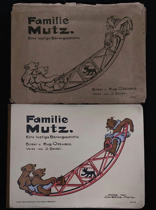 SCHOLZ KÜNSTLER-BILDERBÜCHER.– SEIDEL, Ina: Familie Mutz. Mainz (Jos. Scholz), ca 1930. Quer 4°. 16 S. mit 8 farblithogr. Bildtafeln von Eugen Osswald. farb. ill. OHLn. feines Ex. = Das Deutsche Bilderbuch No 136.