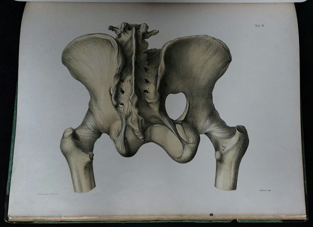 MEDIZIN.– SIMON THOMAS, Abraham Everard: Das schraeg verengte Becken von Seiten der Theorie und Praxis. Nach dem gegenwärtigen Stand der Wissenschaft ; Leyden, Hazenberg, 1861. Fol. VI S., (1 Bl.), 68 S. + 1 gef. Tab. und 7 getönte lith. Tafeln. OHLn. Einband angeschmutzt, Titelseite mit Eckreparatur, StaT, sonst gutes Ex. Seltene EA. Abraham Everhard Simon Thomas (1820-1886), studierte in Leyden, wo er 1845 promovierte. Er liess sich in Rotterdam nieder, wurde jedoch nach Leyden als Professor der Geburtshilfe und Gynäkologie berufen. Hier fing er (da die durch Du Pin früher für den geburtshilflichen Unterricht gestiftete Poliklinik ganz vernachlässigt war) bald an, eine geburtshilfliche Poliklinik zu eröffnen, und hat dadurch das Material für den Unterricht, speziell für den praktischen Teil, so vergrössert, dass es fast nie an Wöchnerinnen mangelt, welche in ihrem eigenen Hause die nöthige Hilfe von den Studierenden empfangen, eine Methode, welche für die selbständige Entwicklung der Jüngeren selbstverständlich von grossem Einfluss war. Auch sein theoretischer Unterricht wurde von jedem seiner Schüler als vortrefflich gerühmt. Seine Monographie „Das schräg verengte Becken“ gilt bei Sachverständigen für eine echt klassische Arbeit. Sein Vorschlag, beim verengten Becken nicht auf die Füße, sondern auf die Knie zu wenden, ist seit dem fast überall angenommen. (Hirsch V, S.407f. + VI, S.1007; Fasbender, S.356)