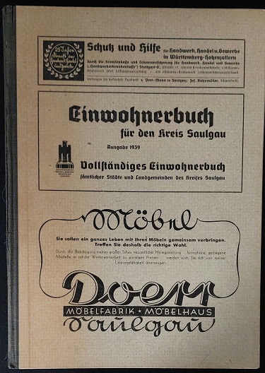 SAULGAU.– EINWOHNERBUCH FÜR DEN KREIS SAULGAU 1939.– Vollständiges Einwohnerbuch des Kreises Saulgau mit folgenden Stadt- u. Landgemeinden: Saulgau, Riedlingen, Mengen, Buchau, Scheer a.D. Stuttgart (Nagy), Juni 1939. 4°. 272 S. mit zahlr. Abb. ill. OHLn. Rücken leicht angeplatzt, sonst gut erhalten. EA.