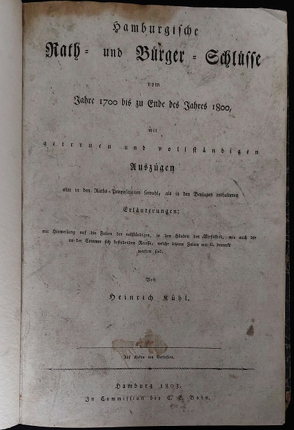HAMBURG- KÜHL, Heinrich: Hamburgische Rath- und Bürger-Schlüsse vom Jahre 1700 bis zu Ende des Jahres 1800. Mit getreuen und vollständigen Auszügen aller … Erläuterungen. Hamburg (Bohn), 1803. Fol. 2 Bl., XI, 260 S. Pbn der Zeit mit Rückenschild. Titelseite bestaubt, sonst gut erhalten. EA. Heinrich Kühl (* 11. April 1748 in Hamburg; † 11. April 1821 ebenda) war ein deutscher Kaufmann und Oberalter. Heinrich Kühl hatte einen gleichnamigen Vater, der als Oberalter an der Hauptkirche Sankt Katharinen gewirkt hatte. Als Kaufmann wurde er 1776 in das Kollegium der Hundertachtziger gewählt. Er gehörte seit 1791 dem Niedergericht an, wurde ein Jahr später Mitglied der Commerz-Deputation und der Kämmerei und 1801 Mitglied der Admiralität. 1803 gab er eine Übersicht von Rat- und Bürgerbeschlüssen heraus, die zwischen 1700 und 1800 gefasst worden waren. Die Publikation bezahlte er selbst. Während der Hamburger Franzosenzeit beteiligte er sich am 19. November 1806, am 21. September 1807 und am 29. Dezember 1810 als Deputierter an Verhandlungen über von der Stadt Hamburg zu leistende Kontributionen. (Wikipedia)