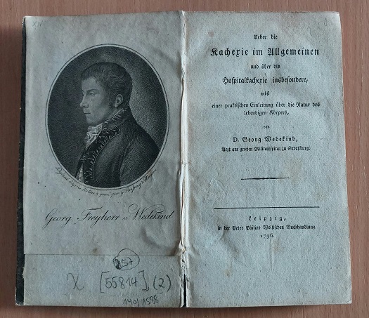 MEDIZIN.– WEDEKIND, Georg Christian Gottlieb von: Ueber die Kachexie im Allgemeinen und über die Hospitalkachexie insbesondere. Nebst einer praktischen Einleitung über die Natur des lebendigen Körpers. Leipzig (Wolf), 1796. kl. 8°. 252 S. mit einem von G. Reußing a Mayence gestochenen Portrait des Verfassers auuf Innendeckel geklebt. Pb der Zeit. Rückengelenke berieben und angeplatzt. EA. Georg Christian Gottlieb Wedekind, seit 1809 Freiherr von Wedekind, (* 8. Januar 1761 in Göttingen; † 28. Oktober 1831 in Darmstadt) war ein deutscher Arzt und Revolutionär. (Wikipedia)