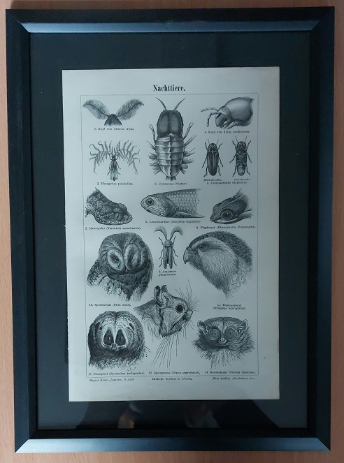 HOLZSTICH.– NACHTTIERE.– Original Bildtafel von 1896 in stilvollem Kunstglasrahmen mit schwarzem Rand. Aus: Meyers Konversations Lexikon. 5. Aufl. Leipzig (BI), 1896. Abbildungsgröße 24 x 15,5 cm. Rahmengröße 31,5 x 23 cm. Schönes dekoratives Blatt mit Mittelfalz und zahlr. Abb. leicht bestaubt, insgesamt gut erhalten – siehe Foto. Mit Mauergecko, Leuchtsardine, Flugfrosch, Sperbereule, Eulenpapagei, Koboldmaki, Plumplori etc.