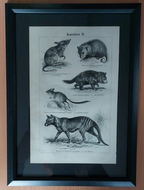BEUTELTIERE II.– Original Bildtafel von 1896 in stilvollem Kunstglasrahmen mit s…