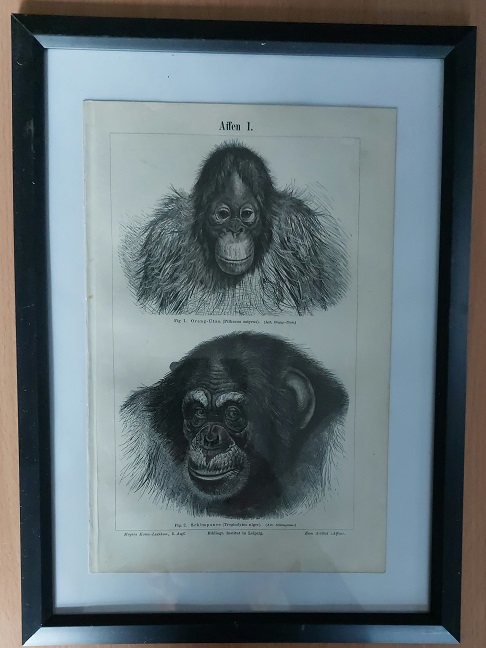 HOLZSTICH.– AFFEN I.– Original Bildtafel von 1896 in stilvollem Kunstglasrahmen mit schwarzem Rand. Aus: Meyers Konversations Lexikon. 5. Aufl. Leipzig (BI), 1896. Abbildungsgröße 24 x 15,5 cm. Rahmengröße 31,5 x 23 cm. Schönes dekoratives Blatt. leicht bestaubt, insgesamt gut erhalten – siehe Foto. Zeigt Orang-Utan und Schimpanse.