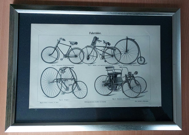 HOLZSTICH.– FAHRRÄDER.– Original Bildtafel von 1896 in stilvollem Kunstglasrahmen mit silbernem Rand. Aus: Meyers Konversations Lexikon. 5. Aufl. Leipzig (BI), 1896. Abbildungsgröße 24 x 15,5 cm. Rahmengröße 31,5 x 23 cm. Schönes dekoratives Blatt. leicht bestaubt, insgesamt gut erhalten – siehe Foto. Zeigt Sicherheistzweirad, Militärzweirad, Rennzweirad, Cripper, Daimlers Motorrad.