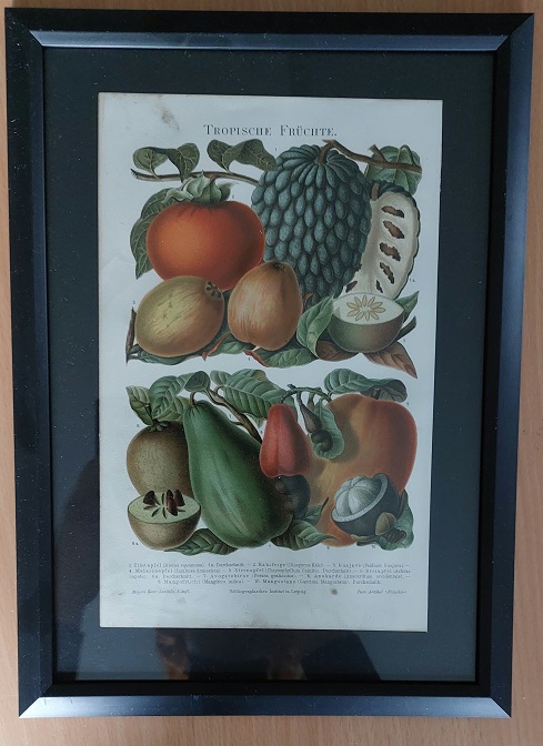 FARBLITHOGRAPHIE.– TROPISCHE FRÜCHTE.– Original farbige Bildtafel von 1896 in stilvollem Kunstglasrahmen mit schwarzem Rand. Aus: Meyers Konversations Lexikon. 5. Aufl. Leipzig (BI), 1896. Abbildungsgröße 24 x 15,5 cm. Rahmengröße 31,5 x 23 cm. Schönes dekoratives Blatt. leicht fleckig, insgesamt gut erhalten – siehe Foto. Zimtapfel, Kakifeige, Guajave, Malaienapfel, Sternaopfel, Breiapfel, Avogatobirne, Anakarde, Mangofrucht etc