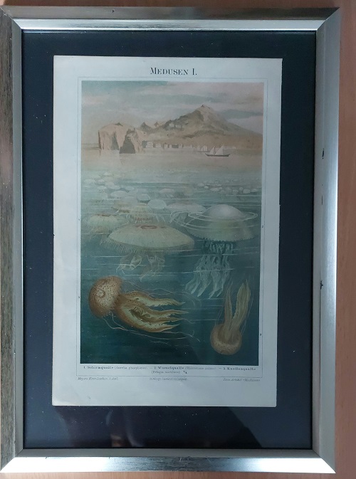 FARBLITHOGRAPHIE.– MEDUSEN I.– Original farbige Bildtafel von 1896 in stilvollem Kunstglasrahmen mit silbernem Rand. Aus: Meyers Konversations Lexikon. 5. Aufl. Leipzig (BI), 1896. Abbildungsgröße 24 x 15,5 cm. Rahmengröße 31,5 x 23 cm. Schönes dekoratives Blatt. leicht fleckig, insgesamt gut erhalten – siehe Foto. Schirmqualle, Wurzelqualle, Knollenqualle.