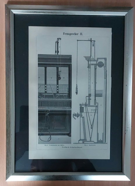 HOLZSTICH.– FERNSPRECHER II.– Original Bildtafel von 1896 in stilvollem Kunstglasrahmen mit silbernem Rand. Aus: Meyers Konversations Lexikon. 5. Aufl. Leipzig (BI), 1896. Abbildungsgröße 24 x 15,5 cm. Rahmengröße 31,5 x 23 cm. Schönes dekoratives Blatt. leicht bestaubt, insgesamt gut erhalten – siehe Foto. Zeigt Vielfach-Schaltschrank.