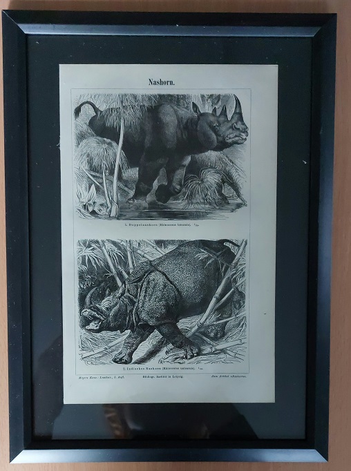 HOLZSTICH.– NASHORN.– Original Bildtafel von 1896 in stilvollem Kunstglasrahmen mit schwarzem Rand. Aus: Meyers Konversations Lexikon. 5. Aufl. Leipzig (BI), 1896. Abbildungsgröße 24 x 15,5 cm. Rahmengröße 31,5 x 23 cm. Schönes dekoratives Blatt. leicht bestaubt, insgesamt gut erhalten – siehe Foto. Doppelnashorn und Indisches Nashorn.