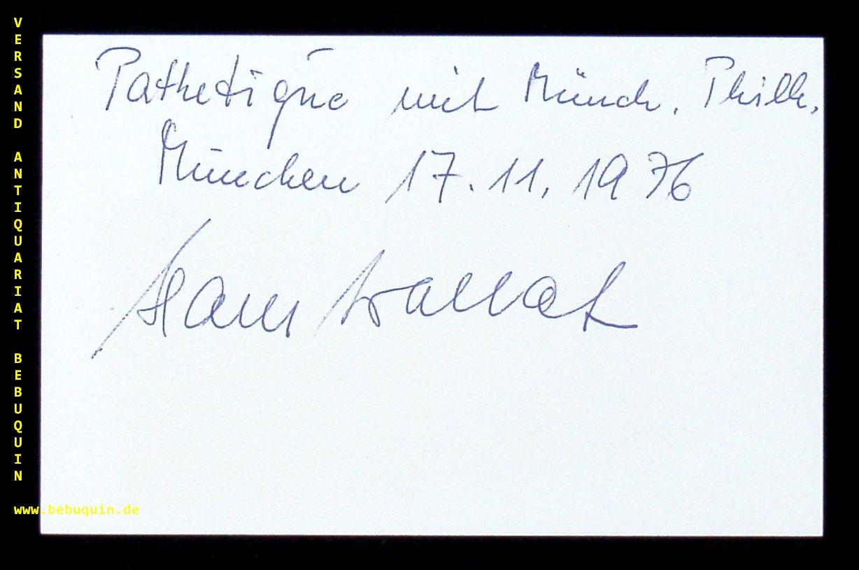 WALLAT, Hans (Dirigent): eigenhändig signierte und datierte Autogrammkarte. München (Philharmonie), 17.11.1976. 8 x 12,5 cm. Karteikarte. Hans Wallat (* 18. Oktober 1929 in Berlin; † 11. Dezember 2014 in Hilden) war ein deutscher Dirigent. (Wikipedia)