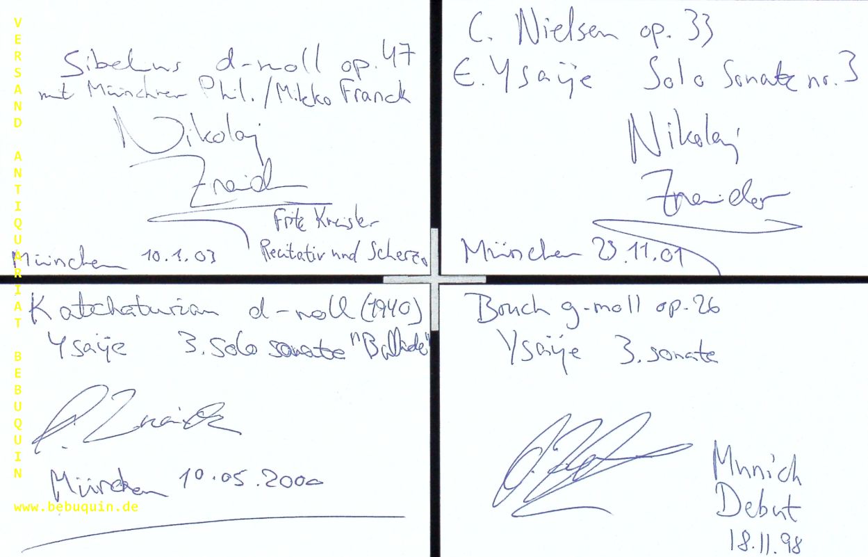 ZNAIDER, Nicolaj (Violinist): 5 eigenhändig signierte und datierte Autogrammkarte. München (Herkulessaal), 1998 – 2003. 8 x 12,5 cm. 5 Karteikarte. Nikolaj Szeps-Znaider (* 5. Juli 1975 in Kopenhagen) ist ein dänischer Geigenvirtuose und Dirigent. (Wikipedia)