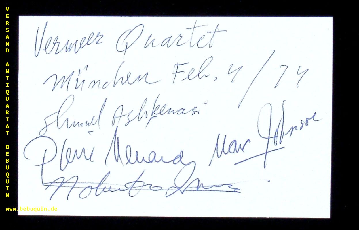 VERMEER-QUARTETT.– ASHKENASI, Shmuel + MENARD, Pierre + NOBUKO, Imai + JOHNSON, Marc: eigenhändig von allen signierte und datierte Autogrammkarte. München, 1975 + 1990. 8 x 12,5 cm. Karteikarte und schönes Portraitbild. The Vermeer Quartet was a string quartet founded in 1969 at the Marlboro Music Festival in Vermont and active until 2007. (Wikipedia)
