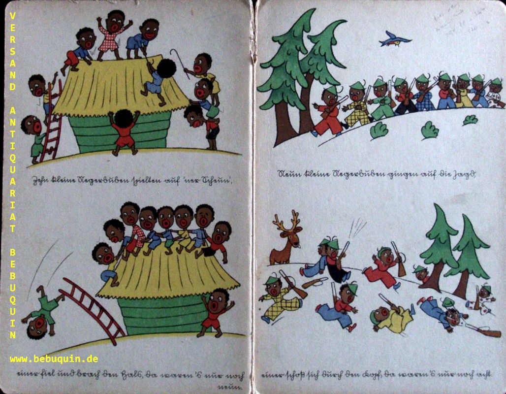 ZEHN KLEINE NEGERBUBEN.– Mainz (Jos. Scholz), (1936). 28 x 18 cm. 6 (incl. Einband) farb. illustrierte Hartpappen mit Bildern von [Beatrice Braun-Fock.] farb. ill. OHLn. Einband gering angeschmutzt, ansonsten gute Erhaltung. Diese Ausgabe von allergrößter Seltenheit. Verlagsnummer 7205. Einzig mir zugänglicher Nachweis bei DBV 21, S. 364., Schug 1909.