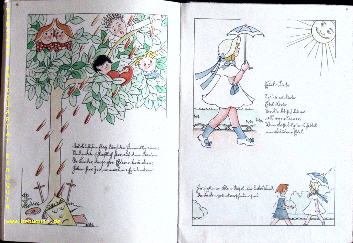 VIGNA, Erny: Die sieben Früchtchen. Ein Bilderbuch. Berlin-Grunewald (Klemm), (1932). 4°. 20 Bl. mit farb. Illustrationen des Verfassers in Sütterlin. farb. ill. OHLn. Einband etwas berieben und bestoßen, innen von guter Erhaltung. seltene EA dieser skurril und eigenwillig illustrierten Struwwelpeteriade mit 6 Geschichten, die ganz neue Unarten schildern. Rühle 406 beschreibt nur 19 Bl. und kennt wohl nicht die letzte Illustration sowie die Verlagswerbung auf der letzten Seite.