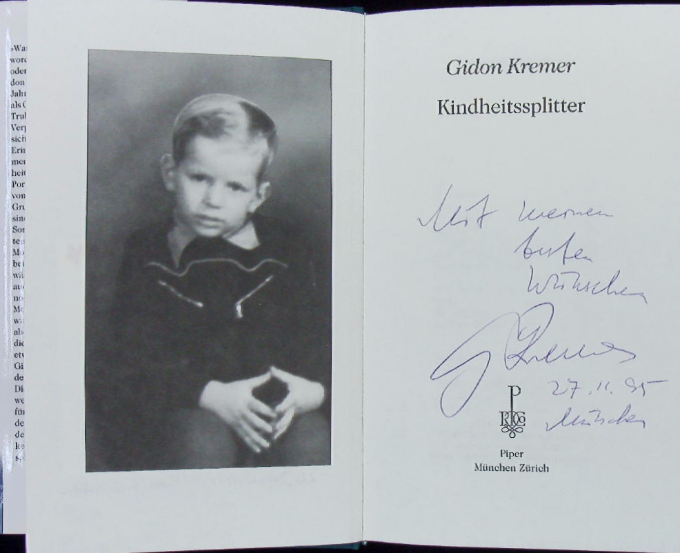 KREMER, Gidon: Kindheitssplitter. München/Zürich, (Piper), 1993. 232 S. mit Abb. + 3 mont. Privatfotografien von den Konzerten 1995 + 2000 in der Münchnner Philharmonie. OLn mit OUmschl. EA mit einer eigenhändigen voll signierten und datierten Widmung des Verfassers auf Titelseite.