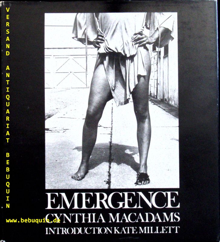 MACADAMS, Cynthia: Emergence. Introduction Kate Millett. New York (Chelsea House), 1977. 4°. 120 S. mit zahlr. Portraittafeln starker Frauen. OPb mit OUmschl. gutes Ex. EA. Emergence began as a collection of portraits of women friends and became a feminist statement of the 1970s. Steven Kasher of New York Kasher Gallery said: This work is pertinent because we want to see what these amazing women looked like when they were in their prime, shaking things up. The spirit of that struggle is in the pictures. Cynthia captures them boldly, without trying to be complex or intellectual. In her artist s statement for the book, MacAdams said: I looked for women . who had strength and softness in their eyes and a directness in the way they dealt with their life. Some of the „second-wave“ feminists who are presented in the book include: Judy Chicago, Michelle Phillips, Gloria Steinem, Lily Tomlin, Jane Fonda, Phyllis Chesler, Laurie Anderson and Meredith Monk. (Kloof)