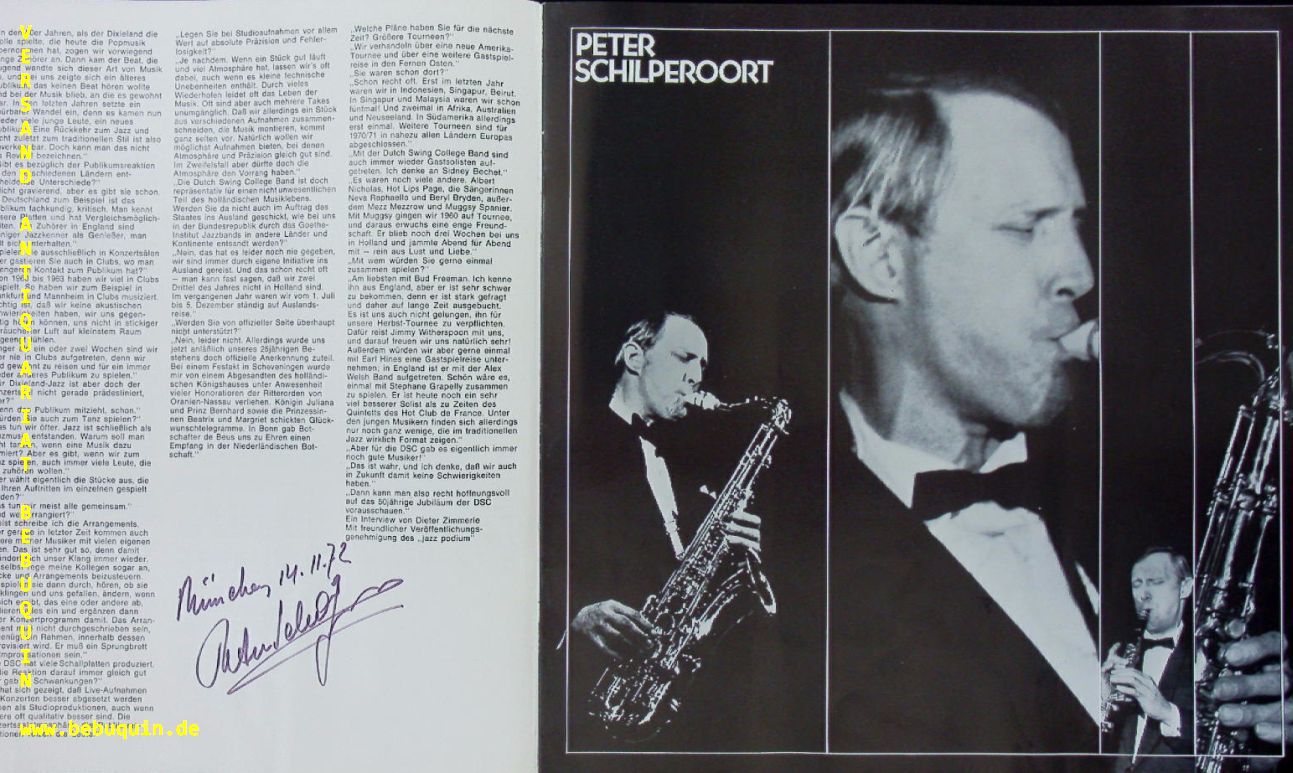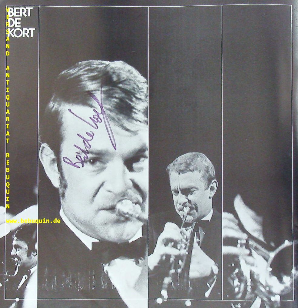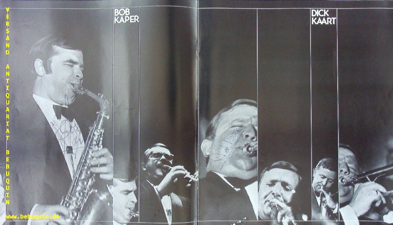 JAZZ.– WILSON, Teddy (Pianist) + SCHILPEROORT, Peter (Saxophonist) + KAPER, Bob (Saxophonist) + KAART, Dick (Posaunist) + DE KORT, Bert (Trompeter) + LIGTHART, Arie (Gitarrist) + JANSSEN, Hüb (Schlagzeuger) + VAN DRAKESTEIN, Bosch (Bassist): 25 Years The Dutch Swing College Band. eigenhändig signierte und datierte Autogrammkarte (Wilson) + Programmheft (Band). Essen, 14.11.1972. 8 x 12,5 + 26,5 x 26,5 cm. 8 + 1 Bl. mit zahlr. Porraitbildern. ill. OKart. Teddy Wilson (eigentlich Theodore Shaw Wilson; * 24. November 1912 in Austin, Texas; † 31. Juli 1986 in New Britain, Connecticut) gilt als einer der wichtigsten US-amerikanischen Jazz-Pianisten. Die Dutch Swing College Band ist eine seit 1945 bestehende niederländische Band des traditionellen Jazz. (Wikipedia)
