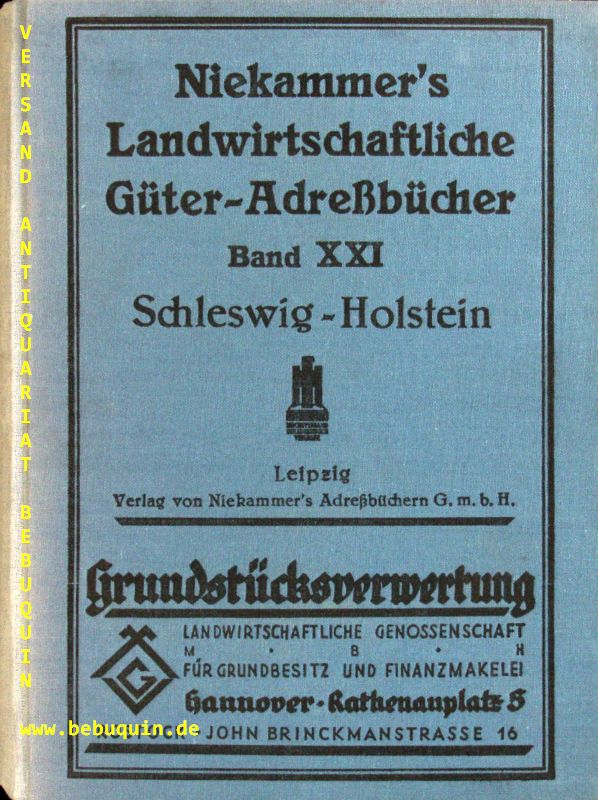 SCHLESWIG-HOLSTEIN.– NIEKAMMER.– LANDWIRTSCHAFTLICHES ADRESSBUCH DER GÜTER UND GRÖSSEREN HÖFE DER PROVINZ SCHLESWIG-HOLSTEIN.– Bd. XXI. Verzeichnis sämtlicher Rittergüter, Güter und größeren Bauernhöfe der Provinz mit Angabe des Grundsteuer-Reinertrages, der Gesamtfläche … Angabe der Besitzer, Pächter und Verwalter, der Post-, Telegraphen- und Eisenbahnstationen … einem alphabetischen Orts- und Personenregister . . . und einer mehrfarbigen Landkarte. Hrsg. von Körding-Itzehoe und Hans Wehner. Leipzig (Niekammer), 1927. Gr. 8°. XXV, 560 S., mit zahlr. Werbeabb. und der Übersichtskarte im Anhang. ill. OLn. Rücken geblichen, sonst tadellos. sehr seltene erste und einzige Ausgabe.