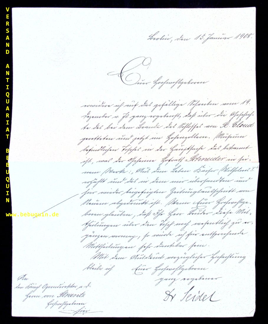 SEIDEL, Paul: einseitiger eigenhändiger (?) signierter Brief an den Operndirektior Ferdinand von Strantz. Es geht um den geretteten Tisch aus dem 1870 von den Franzosnen zerstörten Schloss von St. Cloud. Berlin, 15.1.1908. Quer Gr. 8°. Doppelblatt mit blindgeprägtem Wappen. in den Falzen etwas eingerissen. Paul Seidel (* 14. April 1858 in Schwerin; † 5. Dezember 1929 in Berlin) war ein deutscher Kunsthistoriker und Museumsleiter. (Wikipedia)