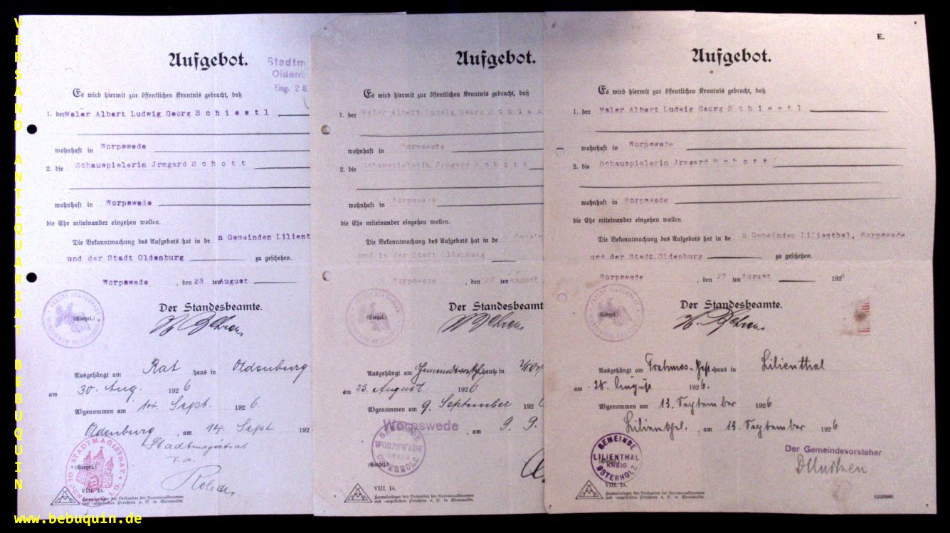 WORPSWEDE.– SCHIESTL, Albert Ludwig Georg: eigenhändig signierte persönliche Urkunden. I. Handschriftlich ausgefülltes Formular des Personalausweises mit Foto vom 6. März 1923. II. 4seitiges Aufgebotsverzeichnis vom 23. August 1926 des Malers Albert Ludwig Georg Schiestl und der Schauspielerin Irmgard Schott mit detailreichen biographischen Angaben und den eigenhändigen Unterschriften der beiden Eheleute. III. 3 Aufgebotsaushänge vom 25.– 30. August 1926 in Lilienthal, Worpswede und Oldenburg mit den entsprechenden Stempeln und Signaturen. IV. Staatsangehörigkeitsausweis der Irmgard Schott aus Hamburg vom 30. Juli 1926 sowie deren Aufenthaltsbescheinigung zum Zwecke der Eheschließung vom 30. Juni 1926. Worpswede, 3.3.1901. unterschiedliche Formate. insgesamt 7 Papiere seitlich gelocht mit Faltspuren. Albert Schiestl wurde 1883 in Erding geboren. Sein Leben lang hatte und malte Albert Schiestl Hunde, denn „ohne Hund kann ich nicht leben“, meinte er. Nach einem gescheiterten Versuch, nach Amerika auszuwandern arbeitete er in Bremen zunächst als Dekorationsmaler, danach in einem Fotostudio. Dort lernte er seine spätere Ehefrau, die Kunstmalerin Annemarie Holländer kennen, 1913 kam Töchterchen Liselotte zur Welt. Nach dem Ersten Weltkrieg zog Albert Schiestl zu Ehefrau und Tochter nach Worpswede und genoss die Gesellschaft der berühmten Künstler der Kolonie. Allerdings nahm sein Leben eine traurige Wendung: Er trennte sich von seiner Frau, dann brannte seine Unterkunft in Worpswede beim sogenanneten Brunnenhofbrand ab, und er verlor alles, was er besaß. Er zog in den Harz, wo er sich mit Malen und Gelegenheitstätigkeiten über Wasser hielt. In unerträglicher Lage nahm er einen von Freunden arrangierten Aufenthalt in einem Nervensanatorium dankbar an. Gestärkt nahm er wieder an Ausstellungen teil und signierte seither mit dem Namen Albert Schiestl-Arding als Reminiszenz an seine Geburtsstadt. Er heiratete 1926 die Schauspielerin Irmgard Schott. Nach der Geburt von Tochter Nora erlebte er eine große Schaffenskraft. 1935 wurde Sohn Thomas geboren. Am 14. Februar 1937 starb Albert Schiestl-Arding; begraben ist er in Worpswede. (Wochenblatt)