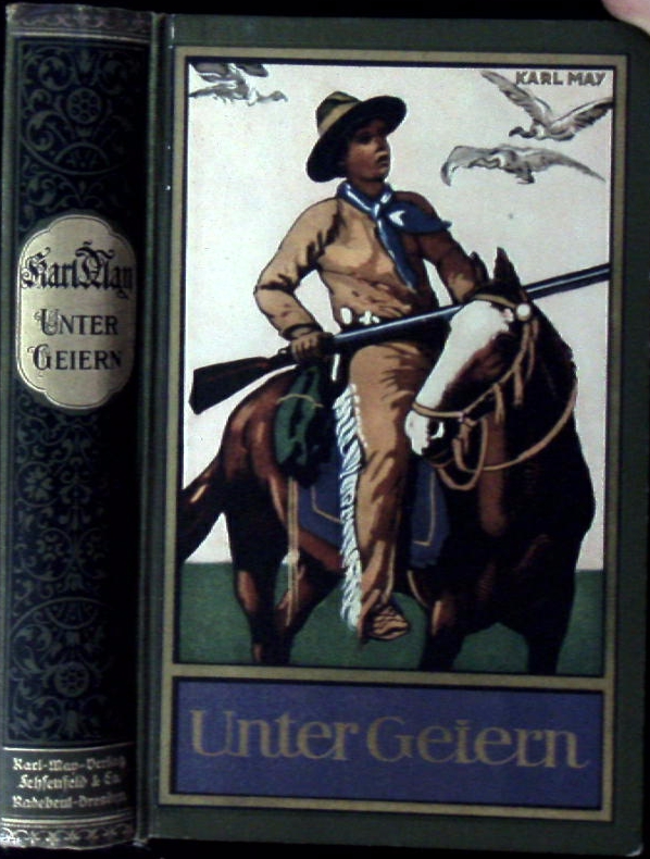 MAY, Karl: Unter Geiern. Erzählung aus dem wilden Westen. 145.-156. Tsd. Volksausgabe. Radebeul (Karl May), (1932). 633 (2) S. farb. ill. OHLn. schief gelesen, sonst feines Ex. mit farbstarkem Einband und leuchtendem Rückengold. = Gesammelte Werke, Bd. 35. Hermesmeier / Schmatz GW 35.19.