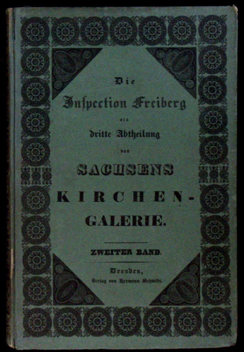 FREIBERG.– SACHSENS KIRCHEN – GALERIE (Kirchengalerie).– Zweiter Band. Die Inspection Freiberg als dritte Abtheilung. Lieferung 38 – 70 (= 33 Lieferungen) in 1 Bd. ( so komplett). Dresden, (Schmidt), 1838. 4°. [1] Bl., S. 150 – 280 mit 64 lithographischen Tafeln mit 65 meist ganzseitige lithografische Ansichten der Dörfer und Kirchen. sowie 1 mehrfach gefaltetes lithographisches Prämienblatt. Bedruckter grüner OPb. Rücken gebräunt, eine Lage lose, vereinzelte Stockflecken, insgesamt von sehr feiner Erhaltung . Der hier vorliegende 2. Bd. der Reihe behandelt sehr zahlreiche Ortschaften der Region um Freiberg mit eindrucksvollen Ansichten: Lichtenberg, Weigmannsdorf, Colmnitz, Naundorf, Ober-Schöna, Linda, Wegefarth, Cuttendorf, Ober Bobritzsch, Weissenborn, Hilbersdorf, Dorfhain, Oederan, Kirchbach, Grillenburg, Klingenberg, Pretzschendorf, Reichenbach, Bräunsdorf Eppendorf, Frankenstein, Gahlenz, Gränitz, Groß-Schirma, Krummenhennersdorf, Langenau, Zethau etc. Bemmann-Jatzwauk 1/2, 385.