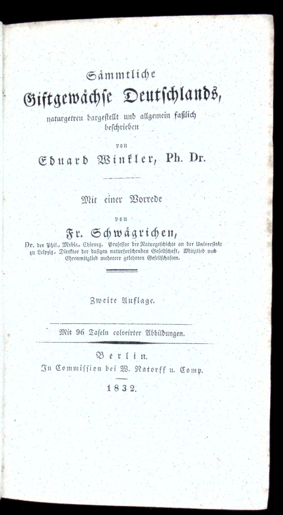 BOTANIK.– WINKLER, Eduard: Sämmtliche Giftgewächse Deutschlands. Naturgetreu dargestellt und allgemein faßlich beschrieben. Mit einer Vorrede von Fr. Schwägrichen. Zweite Auflage. Berlin (Natorff). 1832. [2] Bl., II, XI, 119 S. mit 95 Tafeln colorirter Abbildungen. HLdr der Zeit. Rücken etwas fleckig, sonst nur am Schnitt bestaubt, insgesamt gutes Ex.