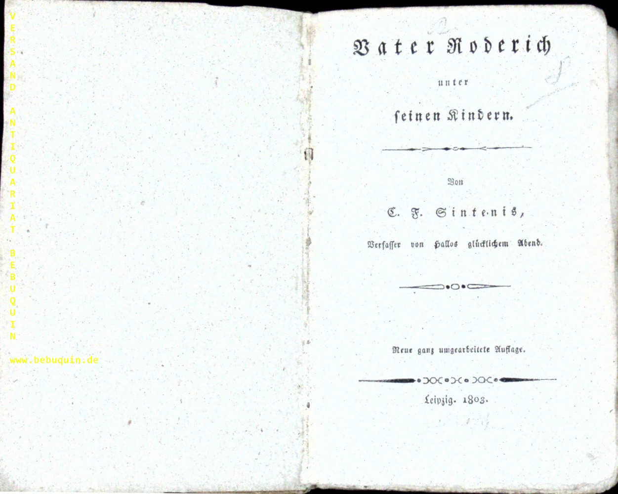 SINTENIS, Christian Friedrich: Vater Roderich unter seinen Kindern. Neue ganz umgearbeitete Auflage. Leipzig, 1803. kl. 8°. 400 S. Pb der Zeit. Kanten berieben und unbeschnitten, Ecken etwas bestoßen.