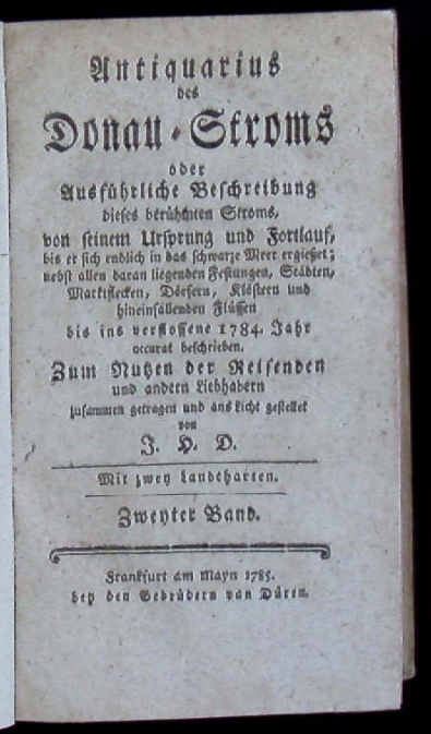 DONAU.– DIELHELM, Johann Hermann: Antiquarius des Donau-Stroms oder ausführl. Beschreibung dieses berühmten Stroms, von seinem Ursprung & Fortlauf bis er sich endlich in das schwarze Meer ergießet. Nebst allen daran liegenden Festungen, Städten, Marktflecken, Dörfern, Klöstern und heineinfallenden Flüssen ; bis ins verflossene 1784. Jahr accurat beschrieben. Zum Nutzen der Reisenden und andern Liebhabern zusammen getragen und ans Licht gestellet von J. H. D. 2. Band (von 2). Frankfurt a. M. (van Düren), 1785. S. 507 – 878. Pb. der Zeit. Papier kaum gebräunt, ohne die Karten. EA der Abschnitte 4 + 5 = Ungarn und Serbien. Johann Hermann Dielhelm ( 1702 – 1784) ein Autor gewässerkundlicher Werke. Über sein Leben ist wenig bekannt. Angeblich war er gelernter Perückenmacher. Er veröffentlichte zum Nutzen der Reisenden und anderer Liebhaber Beschreibungen zahlreicher Flussregionen, in denen er die Landschaften, Städte, Schlösser, Festungen und Klöster ausführlich beschrieb.