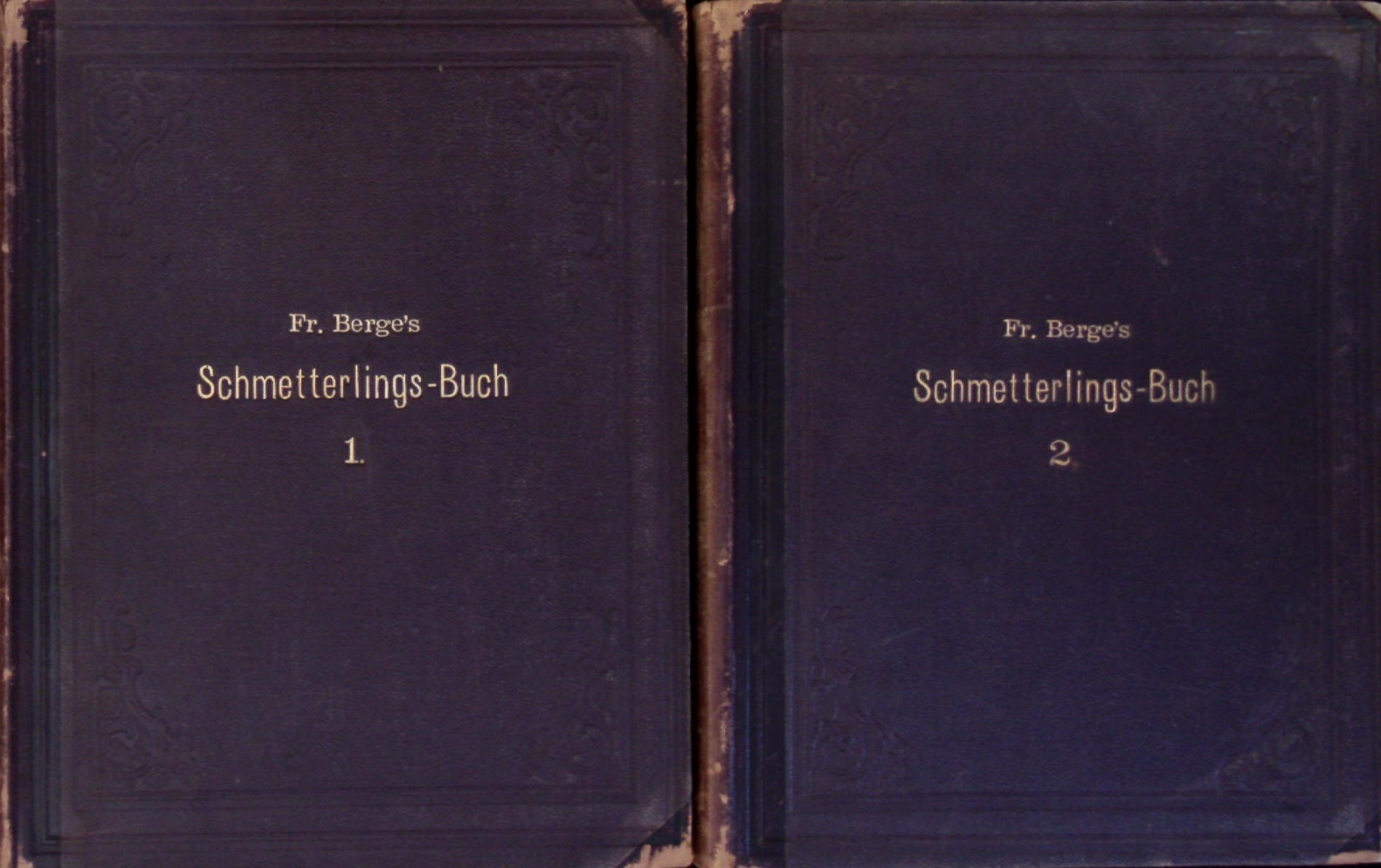 SCHMETTERLINGE.– BERGE, Fr.: Schmetterlings-Buch. Bearb. von H. von Heinemann. Neu durchgesehen von W. Steudekl. 7. Aufl. 2 Bände. Stuttgart (Hoffmann), 1889. 4°. LXIV, 246 S. + 50 farb. Bildtafeln. OHLdr mit goldgeprägter Schrift. Kanten teuils berieben, Rücken geblichen, innen kaum fingerspurig.