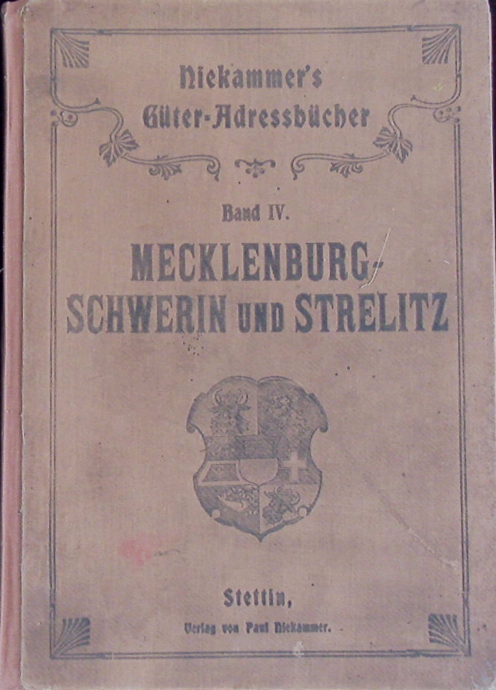 MECKLENBURG.– NIEKAMMER.– GÜTER – ADRESSBUCH VON MECKLENBURG-SCHWERIN UND MECKLENBURG-STELITZ.– Bd. IV. Verzeichnis sämtlicher größerer und mittlerer landwirtschaftlicher Güter beider Länder mit Angabe der Guts-Eigenschaft, des Hufenstandes, der Gesamtfläche … Angabe der Besitzer, Pächter und Verwalter, der Post-, Telegraphen- und Eisenbahnstationen … hrsg. von Vollrath von Lützow. 2. Aufl. Leipzig (Reichenbach), 1908. 4°. XXXX, 297 (6) S. ill. OLn. Alter Rücken neu aufgezogen, Einband und Vorsatz stärker bestaubt, sonst nur vereinzelt fingerspurig. Selten.