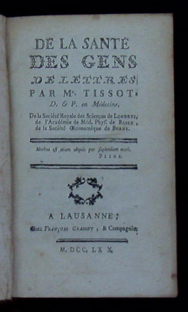 MEDIZIN.– TISSOT, Samuel Auguste André David: De la Santé des gens de lettres. Lausanne (Grasset), 1770. kl. 8°. XII, 204 S. Ldr der Zeit auf 6 Bünden mit goldgeprägtem Rücken. kaum gebräunt, eine Seite leicht berieben. recht seltene EA des Onaniegegners. Auguste André David Tissot (* 20. März 1728 in Grancy; † 13. Juni 1797 in Lausanne) war ein Schweizer Arzt und Professor der Medizin, der zahlreiche Schriften verfasst hat, unter denen insbesondere sein Buch über Epilepsieweite Verbreitung fand und in zahlreiche Sprachen übersetzt wurde. (Wikipedia)