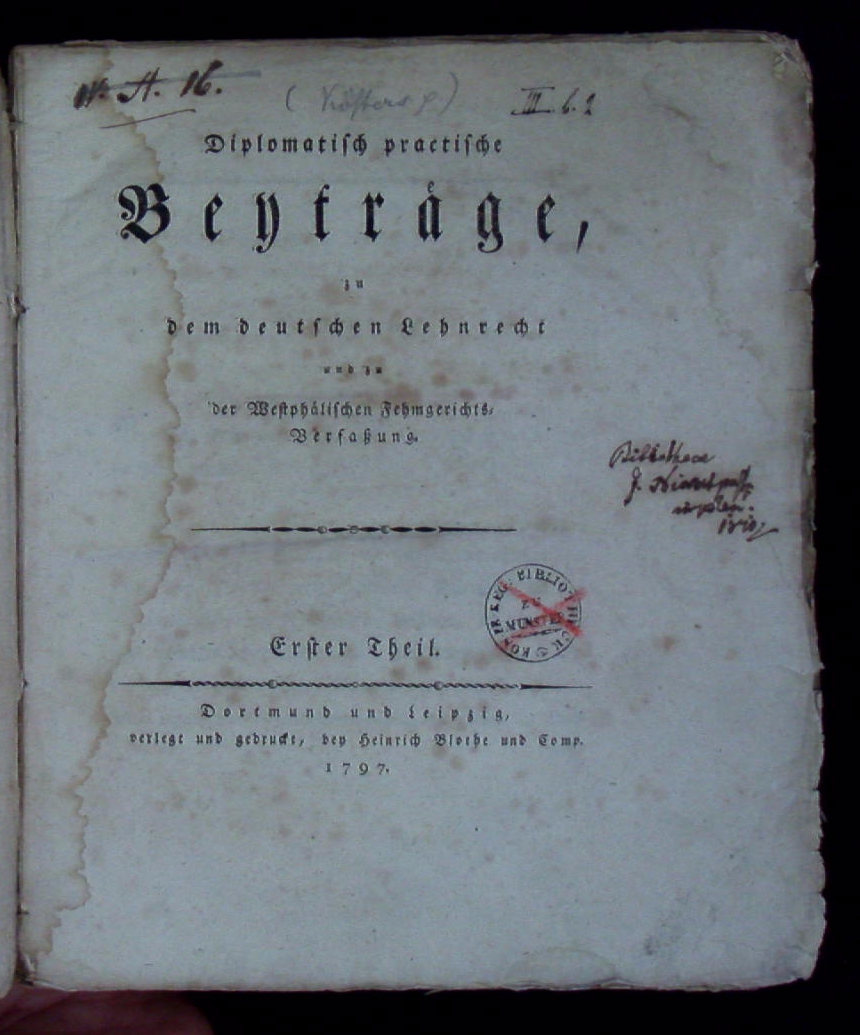 WESTFALEN.– KÖSTER, Ludwig Albert Wilhelm: Diplomatisch practische Beyträge, zu dem deutschen Lehnrecht und zu der Westphälischen Fehmgerichts-Verfaßung. Erster und zweyter Theil sowie Beylage Num. VII. Dortmund (Blothe), 1797/98. Gr. 8°. IV, 267, 466, 110 (4) S. mit 1 gefalteter Kupferkarte u. 2 gefalteten Stammtafeln. OBr. Einband und Titel mit Stempel, unbeschnitten, anfangs wassserrandig, vereinzelt gebräunt. EA. Die Karte zeigt die Umgebung des Kirchdorfs Heessen.