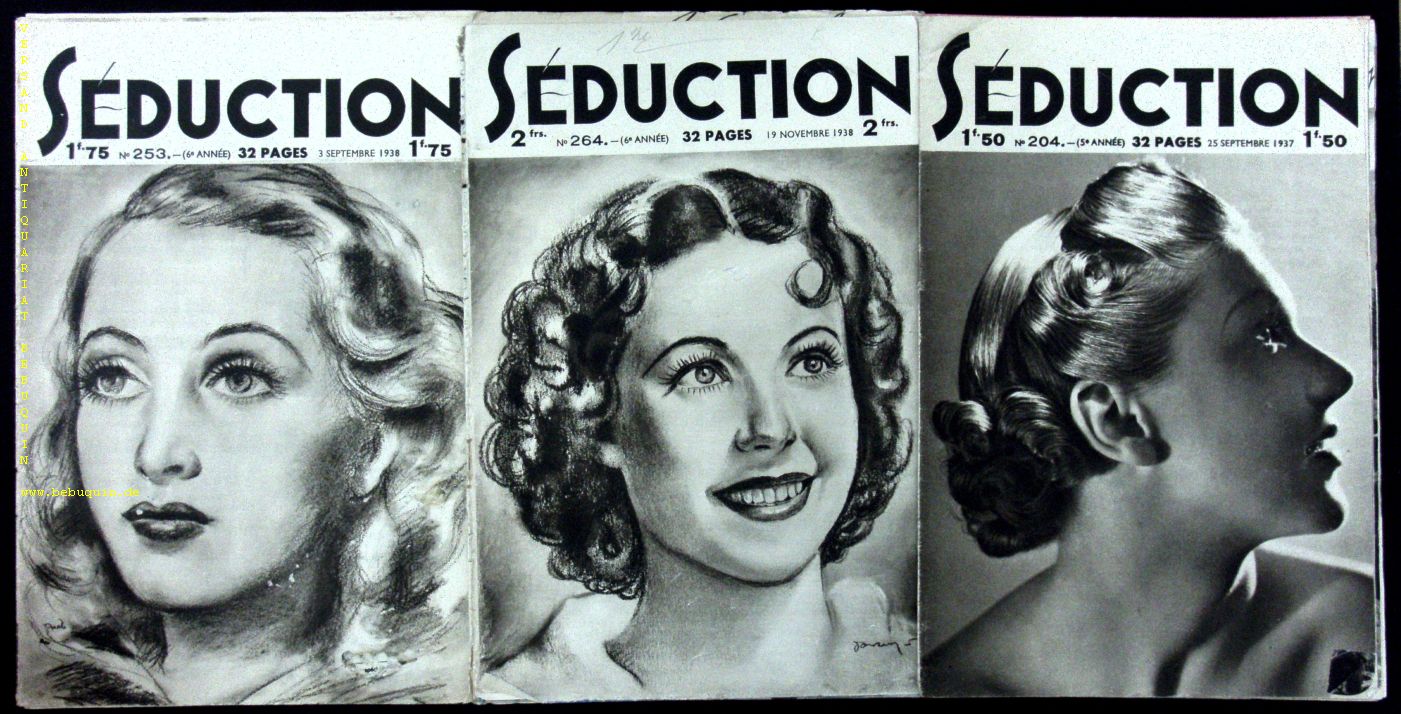 EROTIK.– SEDUCTION.– 5 Nummern der erotischen Zeitschrift. Nr. 134,138/39, 204, 253, 264. Sceaux, 1936 – 38. Gr. 8°. je 32 S. mit zahlr. teils fotografischen Bildern unbekleideter Frauen. ill. OBr. Kanten etwas bestoßen, sonst gutes Ex. EA.
