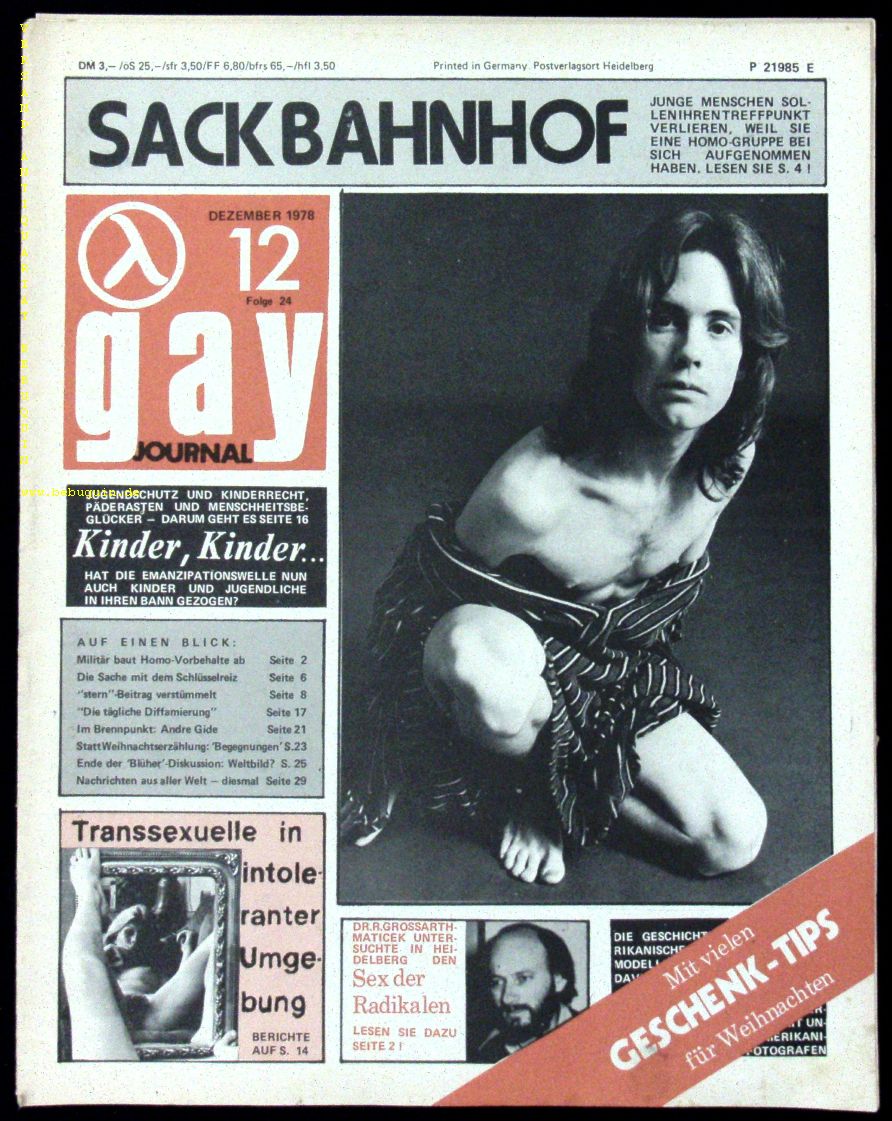 HOMOEROTIK.– GAY JOURNAL. 1978. Heft 12. Das aktuelle Homo-Monatsblatt im neuen Zeitungsformat. Heidelberg (Gassel), Dezember 1978. Fol. 32 S. mit zahlr. Bildern. ill. OBr. gutes Ex. EA.
