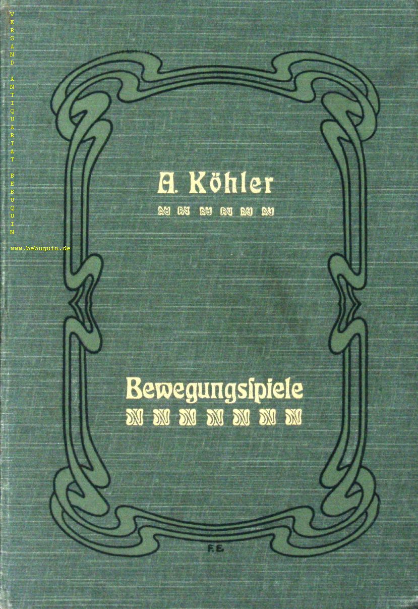 SPIELE.– KÖHLER, August: Die Bewegungsspiele des Kindergartens. Nebst einem Anhange von Ball-, Kugel- und Bauliedern. 13., der 12. gleichlautenden Aufl. Weimar (Böhlau), 1907. Gr. 8°. XLIV, 183 S. mit zahlr. Notenbeispielen. OLn mit Jugendstildesign. gutes Ex.