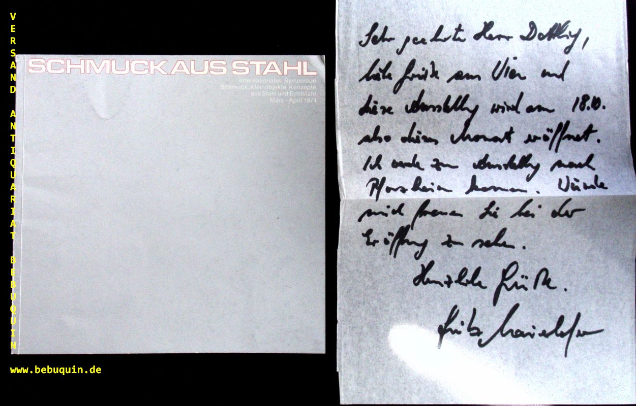 MAIERHOFER, Fritz: Schmuck aus Stahl. Internationales Symposion Schmuck, Kleinobjekte, Konzepte aus Stahl und Edelstahl. Linz (Vöest-Alpine), 1974. Gr. 8°. 70 S. mit zahlr. Bildtafeln. OKart. EA mit einem eigenhändigen seinseitigen signierten an Rolf Dettling Brief inliegend.