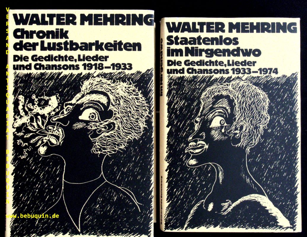 MEHRING, Walter: Werke. Chronik der Lustbarkeiten + Staatenlos im Nirgendwo. Die Gedichte, Lieder u. Chansons 1918 – 1974. 2 Bände. Frankfurt (Büchergilde Gutenberg), 1981/82. 275, 536 S. OLn mit OUmschl. tadellos. 1. Aufl. dieser Ausgabe.