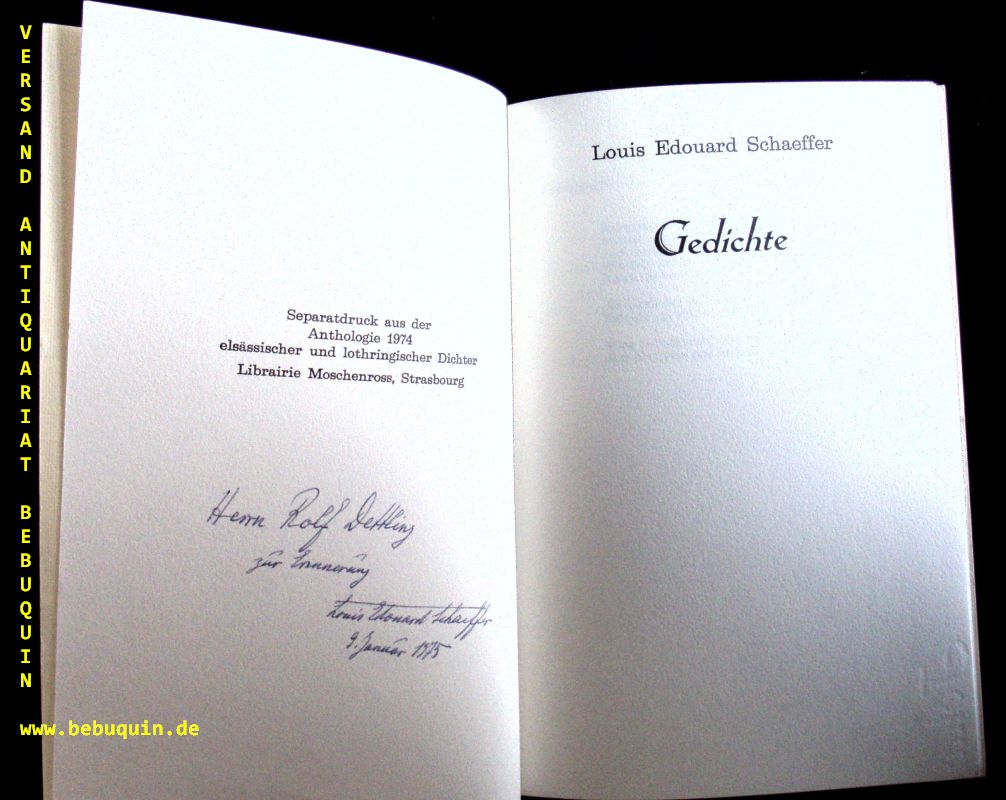 SCHAEFFER, Louis Edouard: Gedichte. Portraits von Meistern und Freunden. Strasbourg (Schaeffer), 1974. 16 S. OHLn. tadellos. EA dieses Separatdrucks mit einer 4zeiligen signierten und datierten persönlichen Widmung des Verfassers auf Vorsatz.