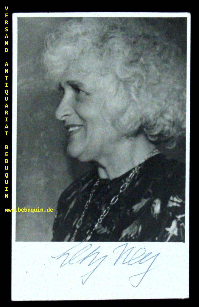 NEY, Elly (Pianistin): eigenhändig signiertes Portraitfoto von G. May. München (Herkulessaal), 26.12.1960. 21 x 15 cm. 1 Bl. Elly Ney (* 27. September 1882 in Düsseldorf; † 31. März 1968 in Tutzing) war eine deutsche Pianistin, die als Interpretin des klassisch-romantischen Repertoires, besonders der Klavierwerke Ludwig van Beethovens, international anerkannt war. Nach 1933 trat sie aktiv für die nationalsozialistische Ideologie ein und ließ sich als Künstlerin von den Machthabern für deren Zwecke instrumentalisieren. Diese Haltung führte nach dem Zweiten Weltkrieg immer wieder zu kontrovers geführten, öffentlichen Diskussionen über ihre Person. (Wikipedia)