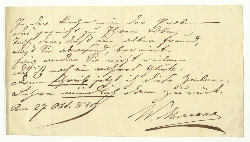 MARSANO, Wilhelm von (1797-1871), Feldmarschallleutnant: Eigenhändiges achtzeiliges Gedicht an einen Ungenannten. 27.10.1849. 21 x 12 cm. 1 S. Marsano wurde als der „Prager Alkibiades“ bezeichnet. Bedeutend als Stratege besonders in den italienischen Feldzügen nach 1848 sowie als Dichter (Dramen und Erzählungen). 1855 geadelt.