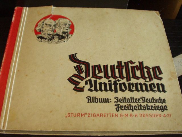 SAMMELBILDERALBEN.– STURM ZIGARETTENFABRIK.– Deutsche Uniformen. Zeitalter Deutsche Freiheitskriege. Dresden, 1932. Quer 4°. 42 S. mit 240 farb. Sammelbildern. farb. ill. OKart. Vorderdeckel und die ersten drei Seiten mit Einriss, ca 5 cm.