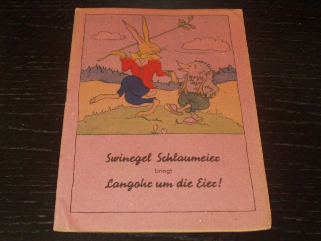 SWINEGEL SCHLAUMEIER BRINGT LANGOHR UM DIE EIER.– Hannover (Hans Werner Brünig), 1948. 8 Bl. mit 8 farb. Bildtafeln. farb. ill. OKart. Schönes seltenes Nachkriegsbilderbuch über Hase und Igel. Vergleiche Mück 5986.