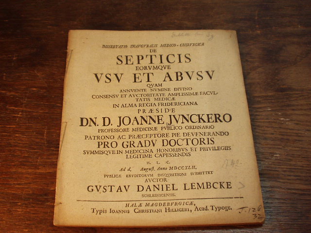 MEDIZIN.– LEMBCKE, Gustav Daniel: Septicis eorumque usu et abusu. Dissertatio inauguralis medico-chirurgia. Eingreicht bei Professor D. Johann Juncker. Halle, Magdeburg (Johann Christian Hilligeri), 1742. 23 S. mit gestochenen Endvignetten. Interimsrücken. gutes Ex. Doktorand stammt aus Schleswig. Mit einer gedruckten Widmung an Monseigneur Le Prince Frederic Ernst, Marggrave de Brandebourg. Johannes Junker (Juncker) (1697-1759), ″ war am 23. September 1679 in Lehndorff bei Giessen in ärmlichen Verhältnissen geboren, widmete sich seit 1697 in Halle dem Studium der Theologie und Philologie und wurde darauf als Lehrer am königlichen Pädagogium in Halle angestellt. Doch gab er diesen Beruf beeinflusst durch die Ausbreitung der Stahl’schen Lehren auf, begann 1707 das Studium der Medicin in Erfurt, und nachdem er nebenher, zur Bestreitung seiner Existenz, verschiedene Stellungen als Hauslehrer bekleidet hatte, kehrte er 1716 wieder nach Halle zurück, wurde hier 1717 Dr. med., erhielt dann die Stelle als Arzt am Waisenhause in Halle, bis er 1730 zum ord. Professor der Medicin an der dortigen Facultät ernannt wurde. In dieser Eigenschaft erwarb er sich das grosse Verdienst, zuerst den klinischen Unterricht in Halle eingeführt zu haben, wobei ihm seine Stellung als Arzt am Waisenhause sehr zu Statten kam. Nach langer ausserordentlicher eifriger Thätigkeit als Lehrer der medicinischen Klinik starb Junker am 21. October 1759. Er war einer derjenige Apostel Stahl’s, die am meisten durch ihre Schriften zur Verbreitung seiner Lehren beigetragen haben.“ Pagel, Hirsch III, pp.429-430