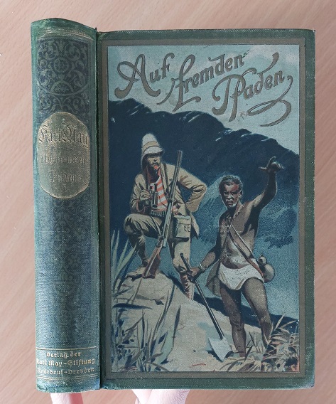 MAY, Karl: Auf fremden Pfaden. Reiseerzählungen. 41.– 43. Tsd. Radebeul (Karl May Stiftung), 1914. 598 (1) S. mit den grünen Laubvorsätzen. farb. ill. OLn. Kanten leicht berieben, Rüchenschild teils geblichen, farbstarke Einbandillustration, innen fein und fest. = Gesammelte Werke,. Bd. 23. Absolut rare Stiftungsausgabe. Hermesmeier / Schmatz GW 23.8 T1.