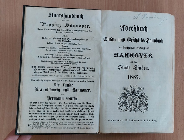 HANNOVER.– ADRESSBUCH 1887 DER KÖNIGLICHEN RESIDENZSTADT HANNOVER.– Stadt- und Geschäfts-Handbuch. Hannover (Klindworth), 1887. XVI, 877. 334, 26 S. sowie 1 Faltplan dert Eisenbahnzüge und einem Sitzplan des Opernhauses. OLn mit goldgerägter Deckelschrift. Kanten leicht berieben, Papier leicht gebräunt. Mit der Sortierung nach Einwohner und Firmen, Straßen und Häusern.